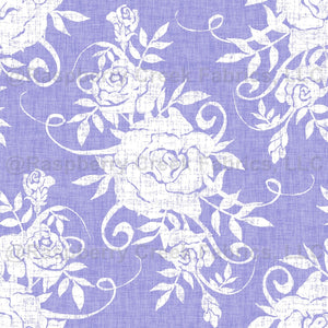 White Roses and swirly foliage with a distressed look, on lilac woven texture. At 150 dpi scale, largest Roses are appx. 4" across.