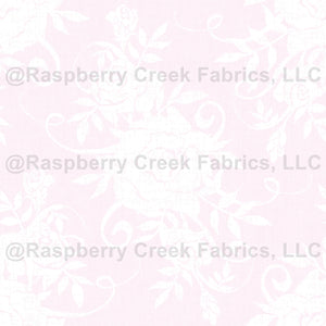 White Roses and swirly foliage with a distressed look, on pale bubblegum pink woven texture. At 150 dpi scale, largest Roses are appx. 4" across.