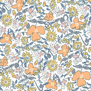 Ditsy floral in muted oranges, yellows and blues. With poppies, sunflowers, berries, blossoms and acorns. Perfect for fall / autumn.