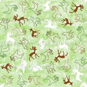 These cute ditsy deer in brown and white on a marbled lime ice background create a fun design for use this winter and Christmas, and all year long.