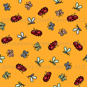 Ladybug doodles along with tiny butterflies and fluttery flies create a fun multicolor ditsy wallpaper design on marigold orange. The variations in the design are an intended feature, not a bug.