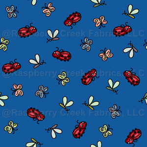 Ladybug doodles along with tiny butterflies and fluttery flies create a fun multicolor ditsy wallpaper design on midnight blue. The variations in the design are an intended feature, not a bug.