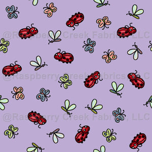 Ladybug doodles along with tiny butterflies and fluttery flies create a fun multicolor ditsy wallpaper design on pastel lilac. The variations in the design are an intended feature, not a bug.