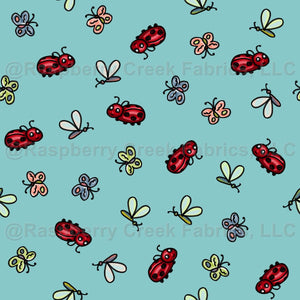 Ladybug doodles along with tiny butterflies and fluttery flies create a fun multicolor ditsy wallpaper design on turquoise. The variations in the design are an intended feature, not a bug.