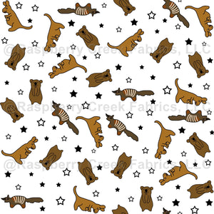 Cute quokkas, kangaroos, and numbats from Australia create a fun ditsy pattern on a white background with scattered star shapes that is sure to please kids of all ages from toddler to teen.
