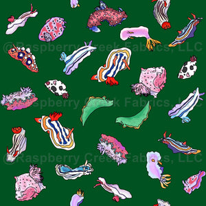 This ditsy multicolor fabric design on deep green features sketches of a variety of sea slugs, which can be quite colorful and come in many shapes and patterns.