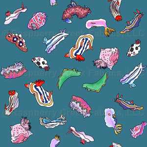 This ditsy multicolor fabric design on teal features sketches of a variety of sea slugs, which can be quite colorful and come in many shapes and patterns.