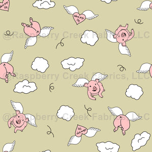 This ditsy design features funny little winged pigs doing loop-de-loops with flying hearts among puffy clouds in a gold khaki sky. The little hearts have text that reads, "When pigs fly."