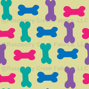 Multi-directional, multi-color scattered dog bones on a golden yellow background. Companion to the Dirty Dog Pattern.