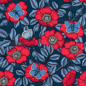 Hand drawn vector pattern with dog rose and common blue butterflies