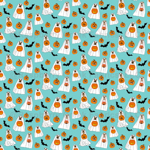 Dogs ghosts bats and pumpkins on turquoise background halloween motif