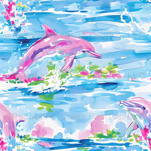 Tropical dolphins dance through painterlywaves and florals in this luxe, splashy coastal dream—perfect for resort spacesand projects.