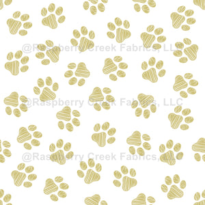 Cute, fun and adorable pattern with doodle paws in gold color on white background. Modern and trendy design, perfect for the dog and cat lover.