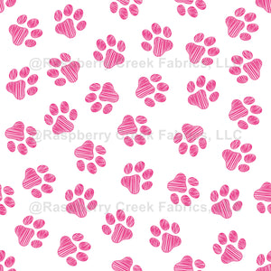 Cute, fun and adorable pattern with doodle paws in pink color on white background. Modern and trendy design, perfect for the dog and cat lover.
