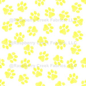 Cute, fun and adorable pattern with doodle paws in yellow color on white background. Modern and trendy design, perfect for the dog and cat lover.