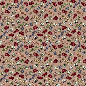 Ladybug and caterpillar doodles along with butterflies and flutterflies create a fun multicolor ditsy fabric design on brush (tan). The imperfections in the design are a feature, not a bug.