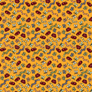 Ladybug and caterpillar doodles along with butterflies and flutterflies create a fun multicolor ditsy fabric design on marigold orange. The imperfections in the design are a feature, not a bug.