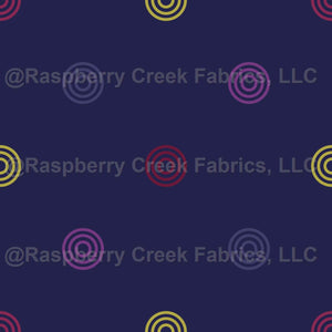 Multicolored concentric circular dots arranged in a grid on a royal blue background. Dots are approximately 1" wide, repeat is 8."