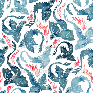 Flying dragons with flames, in blue and red watercolour. Available in MANY colors.