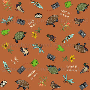 Ducks, turtles, frogs, toads, and dragonflies create a fun ditsy design along with a few wildflowers and cameras on burnt orange.