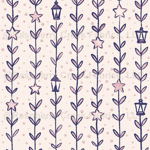 This coordinate from the Storybook Critters collection features vertical leafy garlands with sweet hanging stars and vintage lanterns, sprinkled over a soft polka-dot ground.