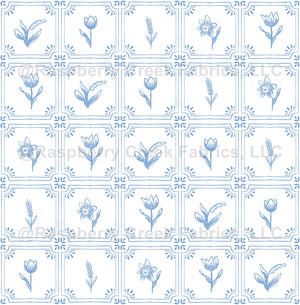 This design features flowers that can be found in the Netherlands such as tulips, daffodils, muscari and snowdrop in traditional dutch style delft tiles.