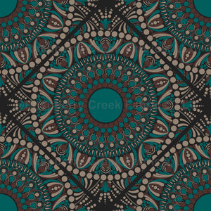 Intricate and floral dot mandala using the East Fork colours Night Swim and Molasses highlighted with Cinereous in a diamond tiled pattern.