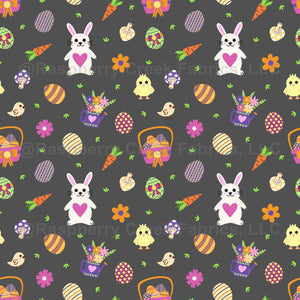 A pattern design featuring Easter egg hunt elements including Easter bunnies, chicks, egg baskets and more on a gray background.