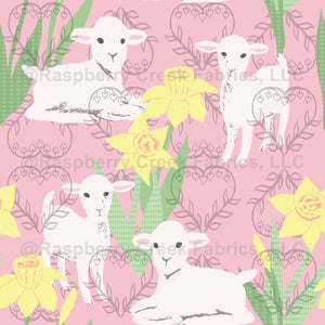 Sweet little lambs, frolicking among daffodils and silhouettes of Bleeding Heart vines on a pink background