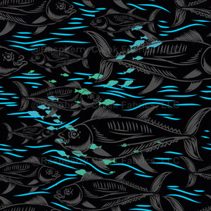 Electric Blue and Black Fish Beachwear Fabric, summer swimsuit, tropical design, ocean fabric, Beach Collection, studios
