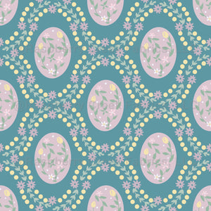 Elegantly painted lavender Easter Eggs with decorative flowers in a damask tile pattern on deep turquoise.