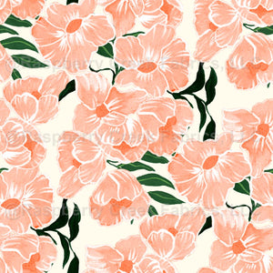 A delicate floral pattern featuring hand-painted peach blossoms with vibrant green foliage on a neutral off-white backdrop.
