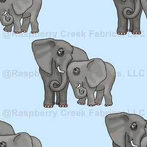 This line art print on sky blue features an adorable mother and baby elephant snuggling.