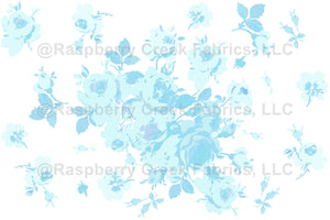 A jumbo sized rose floral in delicious shades of aqua and neptune blues, on fresh white.