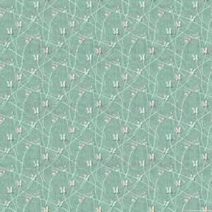 Delicate relief butterflies flutter across a green faux linen background. The embroidery effect adds depth and texture.