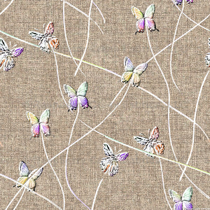 Delicate relief butterflies flutter across a sandy colored faux linen background. The embroidery effect adds depth and texture.