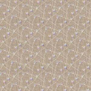Delicate relief butterflies flutter across a sandy sepia faux linen background. The embroidery effect adds depth and texture.