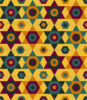 Emerald green, dark green, burgundy and orange stars, against a yellow background.