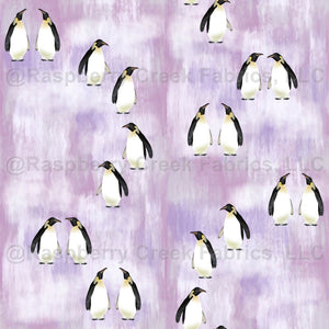 Comic penguins parade in adorable groupings on a distressed abstract orchid print with hints of purple and gray.