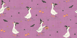 A storybook style design of whimsical Halloween geese in ribboned witch hats with jack o’ lantern baskets, pumpkins, bats and stars on a warm purple linen background.