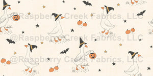 Whimsical Halloween geese in yellow ribboned witch hats with jack o’ lantern baskets, pumpkins, bats and stars on a warm linen background.