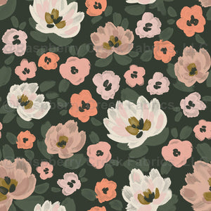 Abstract painterly dark and moody romantic pastel pink florals on a dark green background. Perfect for dresses, onesies, and home decor for achieving a vintage ethereal bohemian aesthetic.