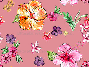A lively and expressive floral pattern bursting with energy and vibrant hues. Inspired by tropical gardens, this design features bold hibiscus blooms and delicate greenery, painted in an intuitive, free-flowing style.