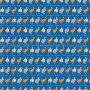 Extinct Dodo Birds in Horizontal Stripes Alternating with a Line of Text on a Blue Background
