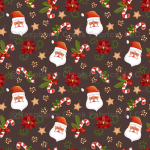 Charming Christmas design featuring Santa, poinsettias, candy canes and festive decors in red and green on brown background.Perfect for holiday decor.