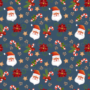 Charming Christmas design featuring Santa, poinsettias, candy canes and festive decors in red and green on cyan background.Perfect for holiday decor.