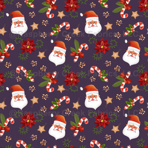 Charming Christmas design featuring Santa, poinsettias, candy canes and festive decors in red and green on plum background.Perfect for holiday decor.