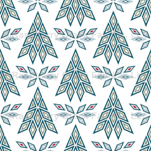 Geometric pine trees based on classic fair isle patterns for an updated twist - Teal and sage on white with touches of red, pink, and light blue