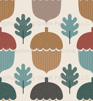 A modern acorn and oak leaf pattern featuring acorns and leaves in fall colors and stripes with a subtle texture effect against a cream background.