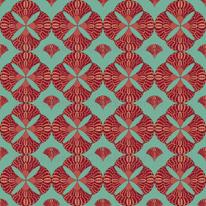 Hand drawn art deco-inspired fans form a mosaic of medallion icons in orange against a mint green background.
